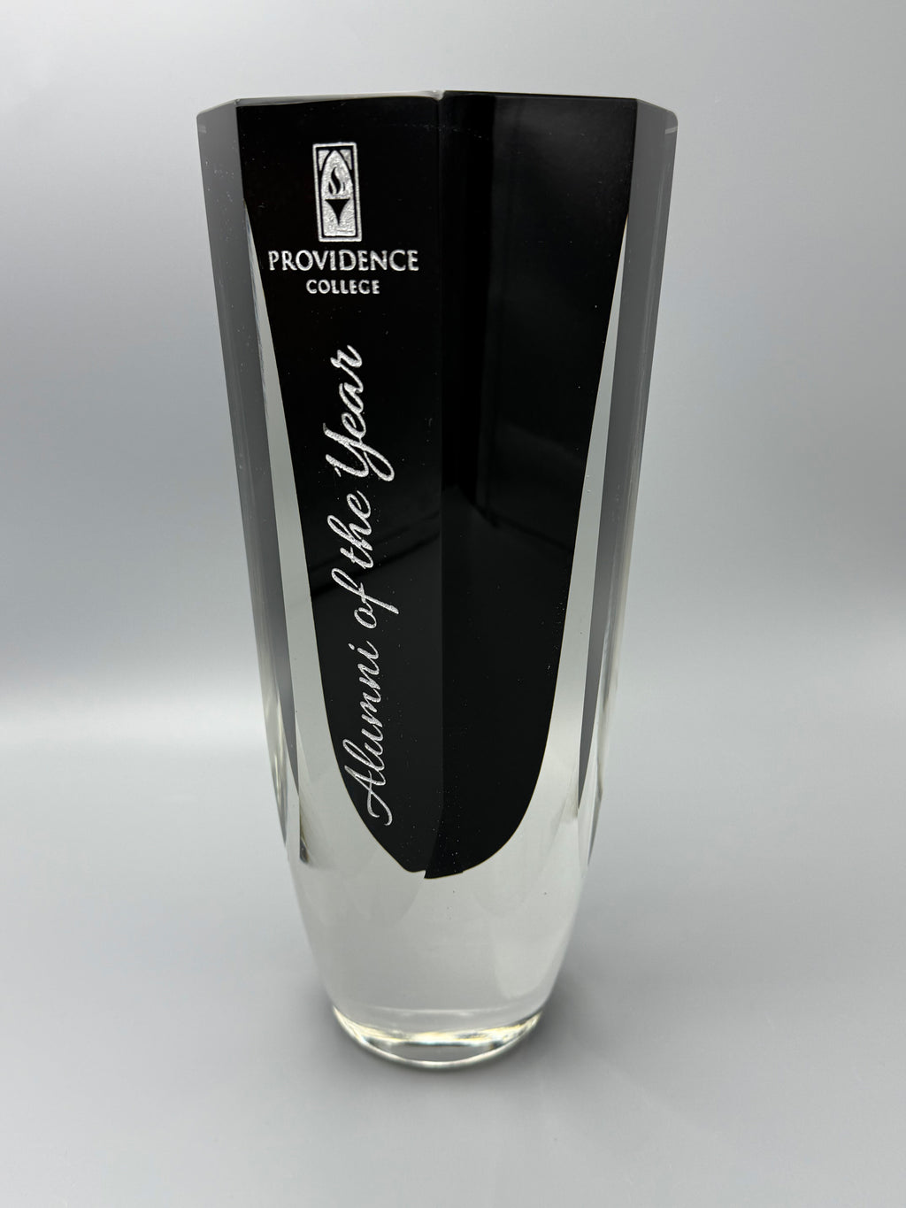 This striking art glass black vase, standing 9-1/2" tall, makes a powerful statement when recognizing top achievers. Featuring a sand-etched, color-filled design on one side, it presents a bold look with ample vertical space for personalized engraving. Perfect for honoring Board Members, Non-Profit leaders, Corporate Awards, or Sales Achievements, this exceptional vase celebrates excellence with style.