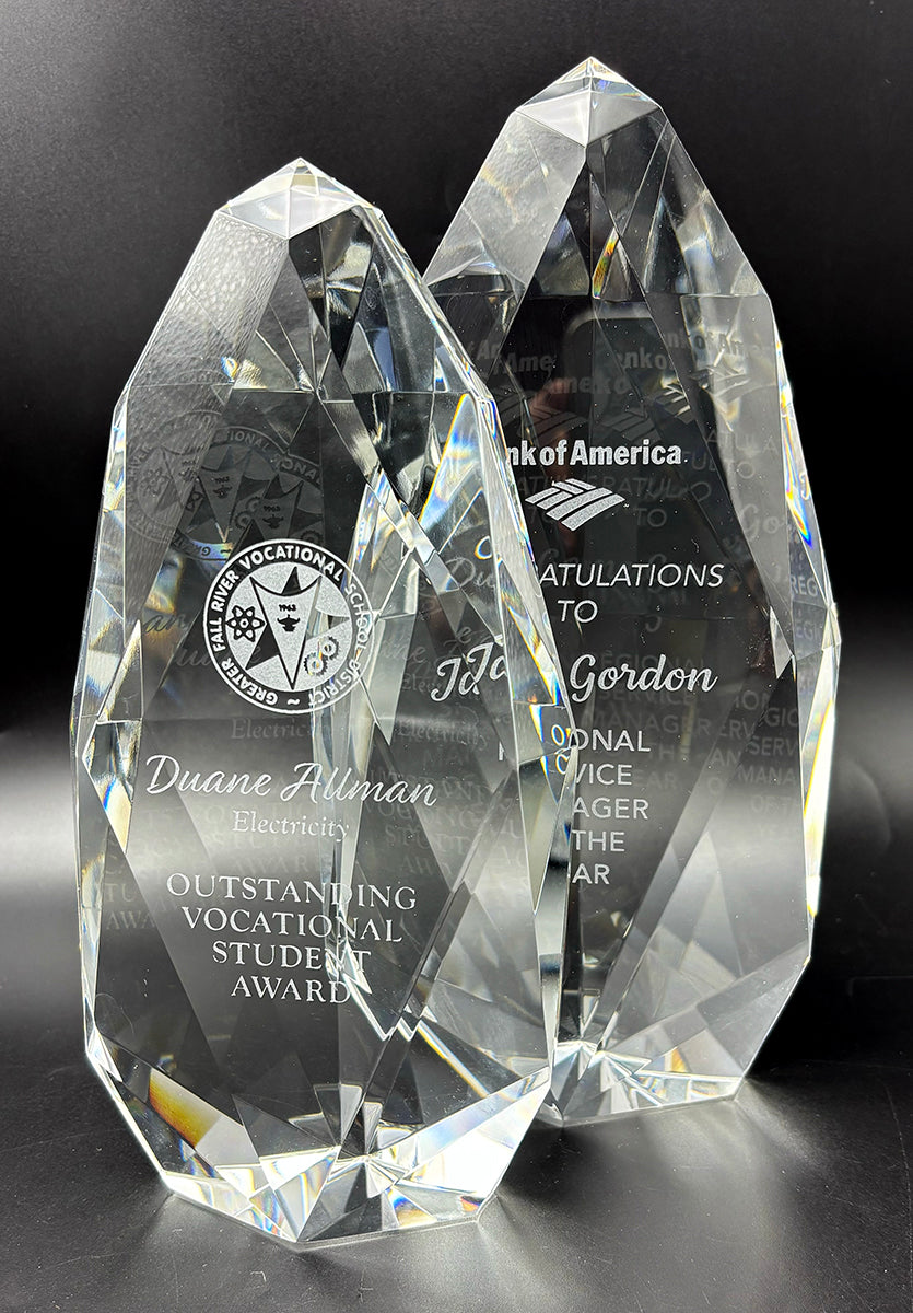 Multi-faceted optic crystal, this heavyweight award comes in two sizes 9" and 8.5". Sand etched on the front for a dynamic appearance to fit the most impressive achievement. Packaged in a lined gift box, this superior piece of crystal is perfect for