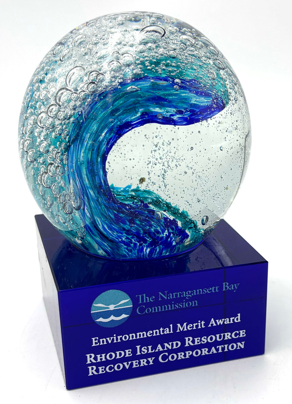 A slightly smaller version of the magnificent Surfside Award features a beautiful crashing blue wave embedded in a perfect sphere. Each art glass piece is unique and one-of-a-kind! All sizes are approximate and will vary from piece to piece. Mounted on a blue crystal base. The Pocket Tide globe is 3" diameter and sits on a 2-3/4" square base, 1-3/4" high.